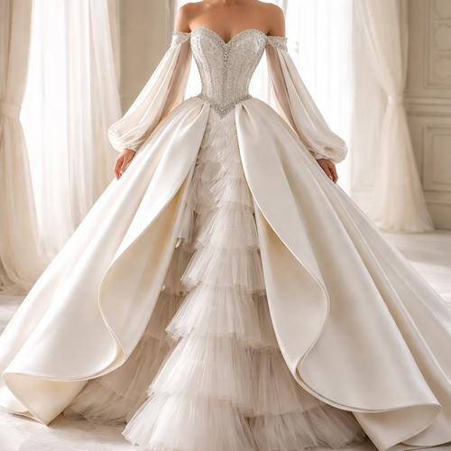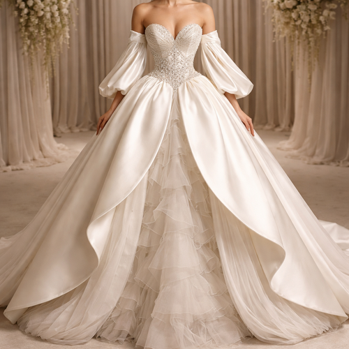 Genera una imagen final del vestido de novia con los detalles escritos sobre la tela y el diseño. Quiero que el corset s...