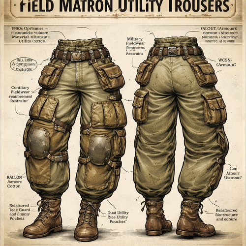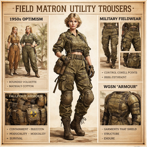 1950s optimism, military fieldwear, FALLOUT/armour and WGSN "Armour". Label the Centre: Field Matron Utility Trousers. 1...