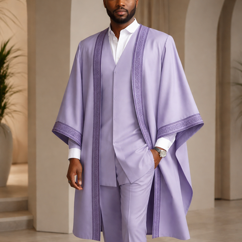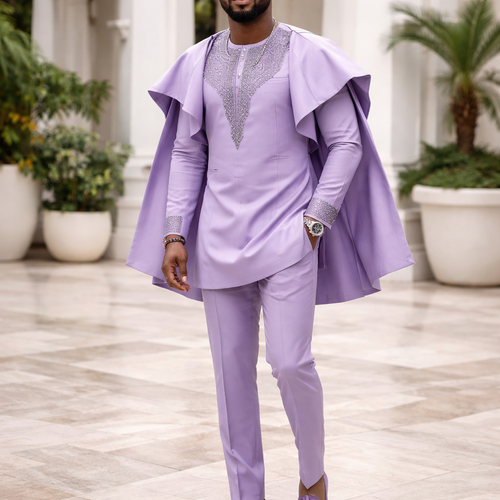 Design a bold, native Nigerian men’s agbada that merges traditional craftsmanship with a modern edge. Use the lavender m...
