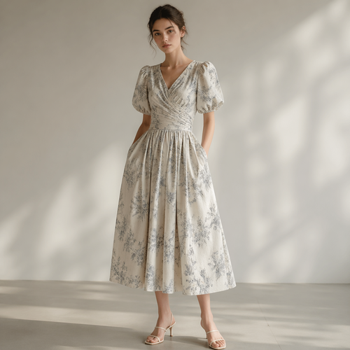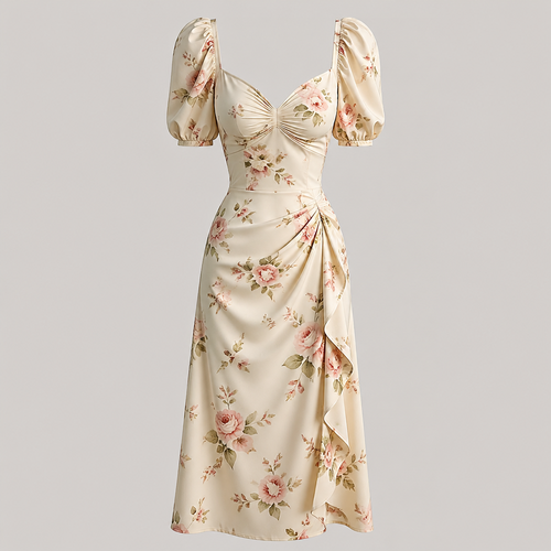 Romantic prairie dress with puff sleeves and wildflower print