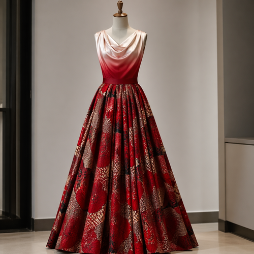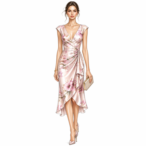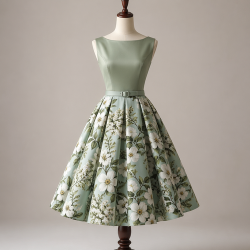 photorealistic fashion design, A Female Dress design. платье в стиле 50 годов, юбка полусолнце принт розовые лилии, лиф ...