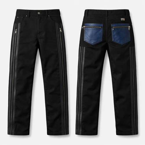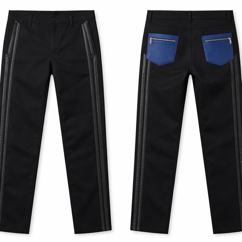 I want to create cotton pants like dickies. On the side of the leg I want two leather stripes stitched on top of the leg...