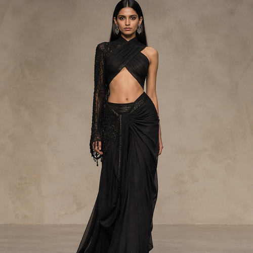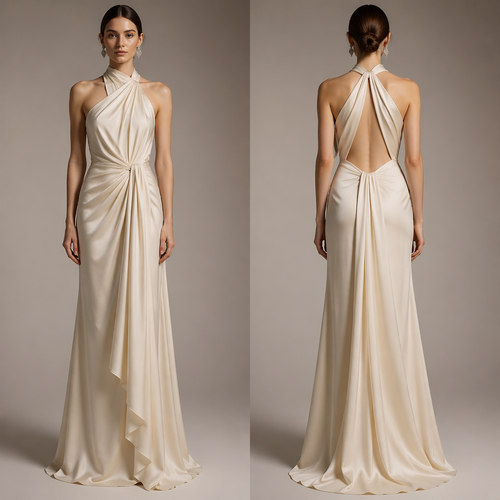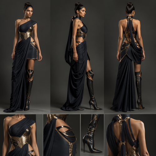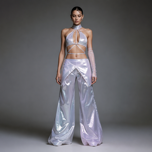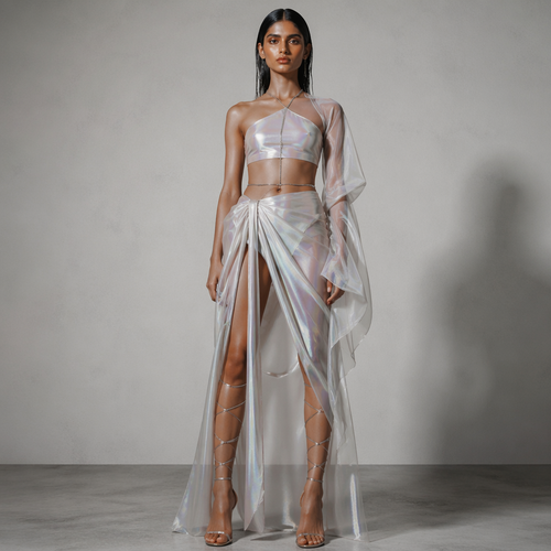 Metallic Horizon Gown A futuristic luxury piece made from pleated metallic fabric that shifts between silver, steel, and...