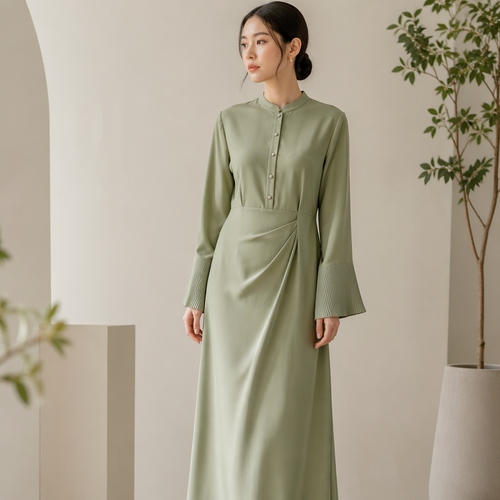 A Female Dress design, suitable for Summer. "Minimalist elegant modest men's koko shirt, sage green premium cotton, high...