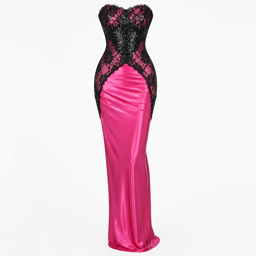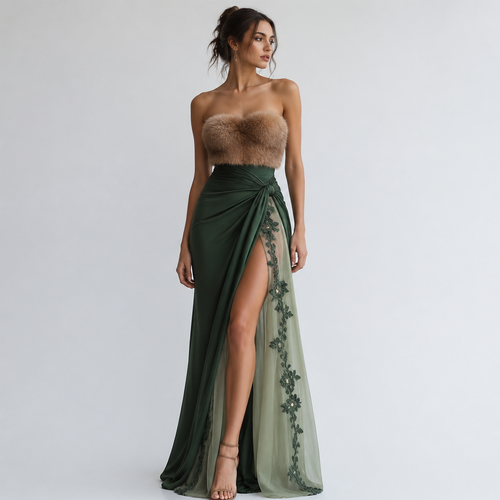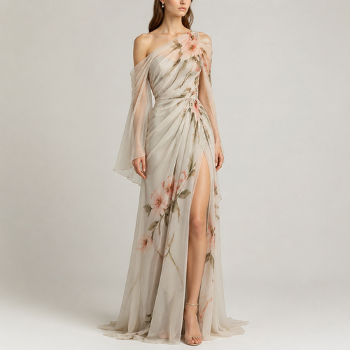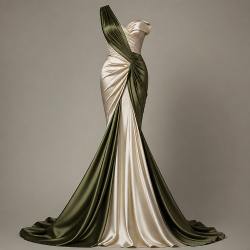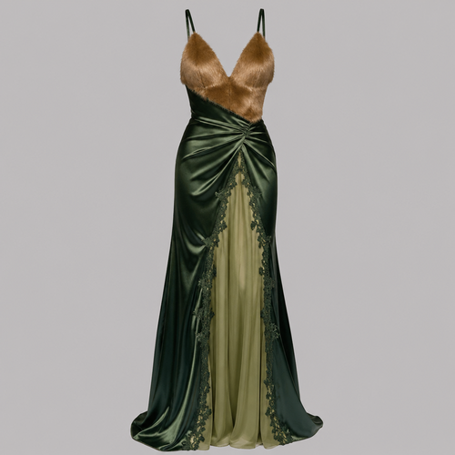 A Female Dress design, suitable for Spring, in Experimental style. I want a futuristic modern piece femme fatale, the to...