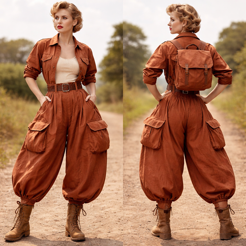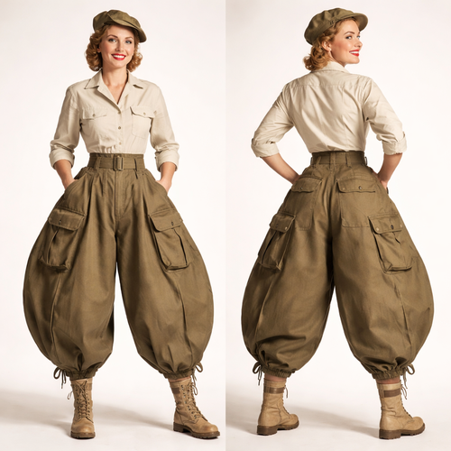 Balloon pants.1950s optimism, military fieldwear, 1950s optimism – rounded volume, material silhouette, utility cotton; ...