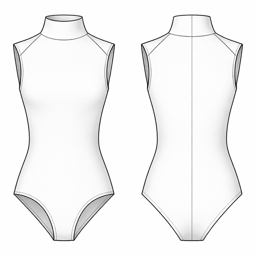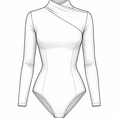 Technical fashion flat of a high-neck bodysuit. The front panel is a single, clean, solid piece that extends all the way...