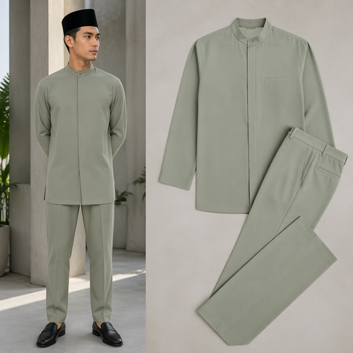 1 set Minimalist elegant modern muslim wear for men with serene sage colour. Singapore fashion aesthetics.