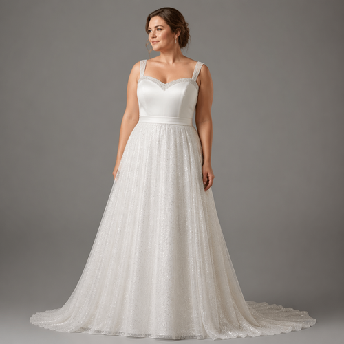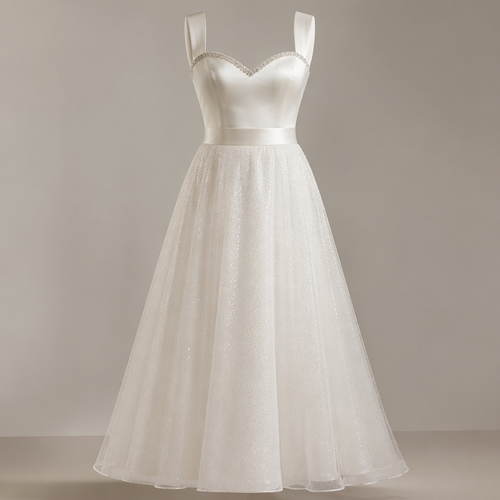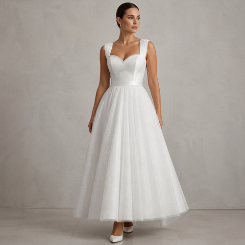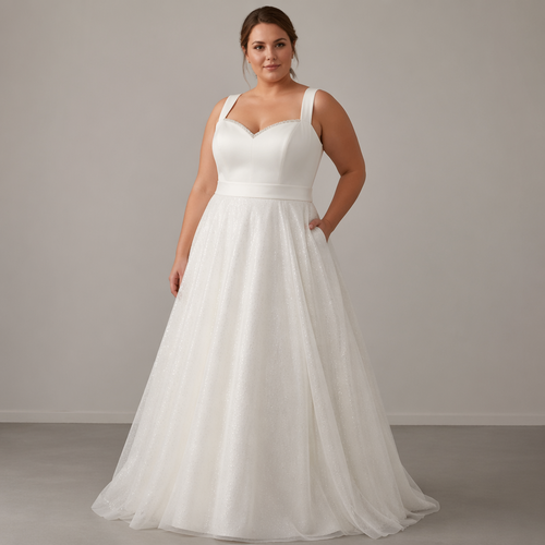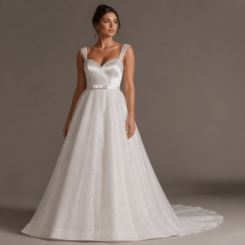 Wedding style dress. UK size 14. White. Silk bodice with a sweetheart neckline, diamonds studded in a line on the top. ...