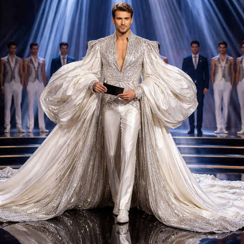 A man hosting a male beauty pageant. He is in an outfit with an overflowing train and overflowing sleeves falling to the...