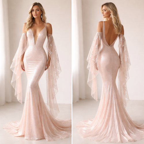 Tight dress especially around the waist, light pink and shell like colour's with lace sleeves which hang and a tail by t...