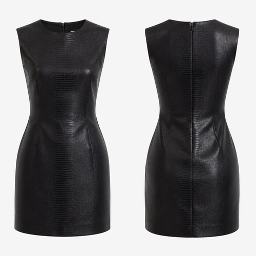 photorealistic fashion design, A Female Dress design, in Edgy style. I want a mini dress with tasteful almost razor shar...