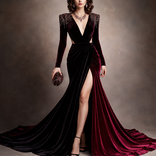 Make me a red and crimson dress with silver accents and a long slit up the right leg it should have a thick silver diam...