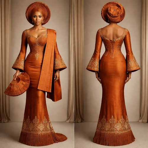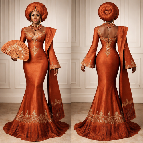 Overall Concept Traditional Yoruba bridal gown in burnt■orange aso■oke, designed to feel regal, ceremonial, and highly s...