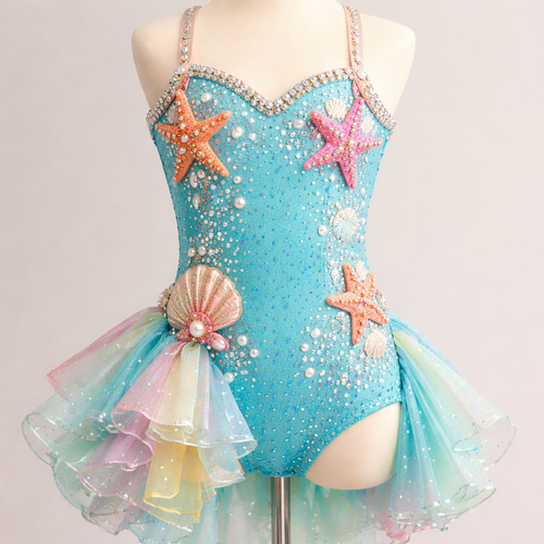 A neon blue midi dress in Sherpa. Is a circle skirt and sweetheart neckline and cap sleeves. Covered in silver crescent ...