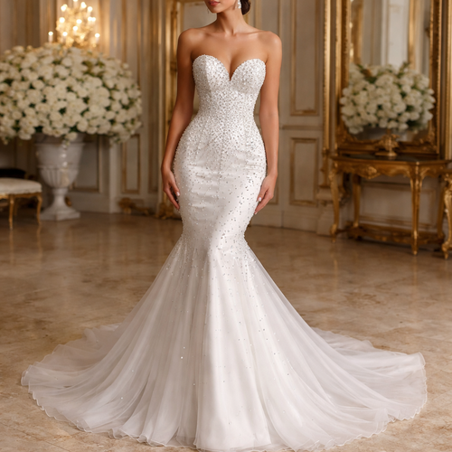 Create a wedding gown in white liquid organza material. Mermaid style, strapless.
