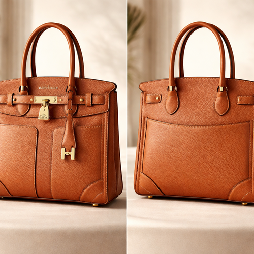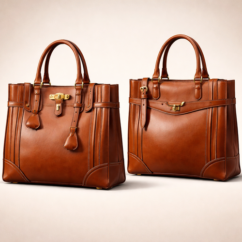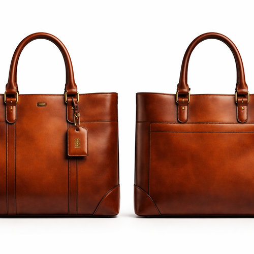 Make me a non gender specific leather tote bag. Brown leader veg tanned. Make high fashion luxury. Make more luxury. Mak...