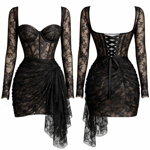 Elegant black lace corset mini dress with long sleeves. The dress features a structured lace corset bodice with visible...
