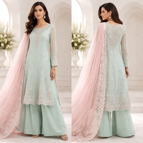 Create a very elegant eastern wear of a-line shirt and plaza pants colors should be mint color shalwar and kameez with p...