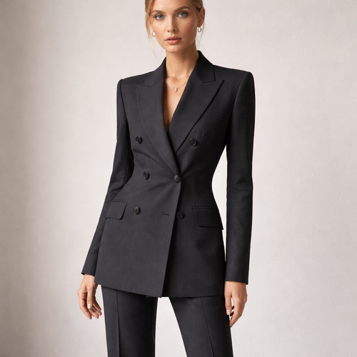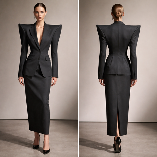 Sharp power suit with peaked lapels and subtle pinstripe detailing