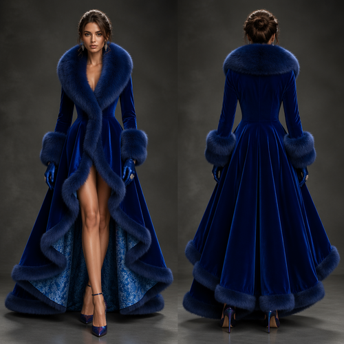 a deep royal blue coat-dress made of a luxurious, velvety fabric with a subtle patterned lining. The coat has a very wid...