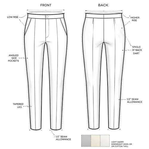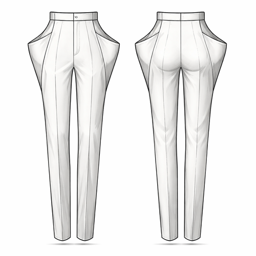 Here is a detailed flat tech drawing for a trouser block inspired by Haider Ackermann's design aesthetic, with a style t...