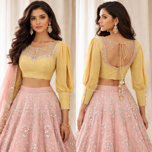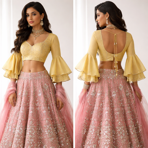 I want a blouse in muted yellow colour with pagoda sleeve and a pink lehenga with mirror work