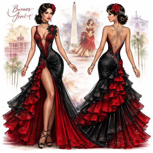 Develop a red dress 💃 , Fashion, Detailed clothes, Style, beautiful, photography, hyperrealism, Vibrant, Color, Cover a...