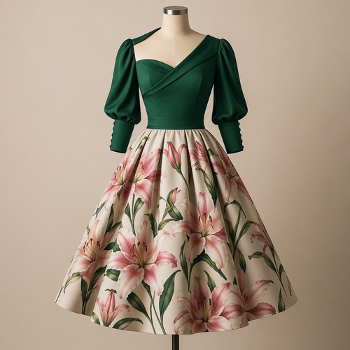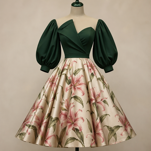 A Female Dress design. платье в стиле 50 годов, юбка полусолнце принт розовые лилии, лиф однотонный темно зеленый, корот...