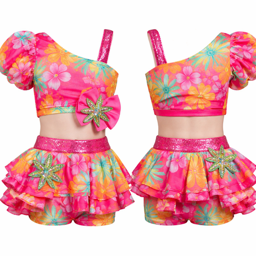 Beach/surf theme girl’s one piece dance costume with 3-layer ruffled skirt and neon colours. Small ruffle cap sleeve and...
