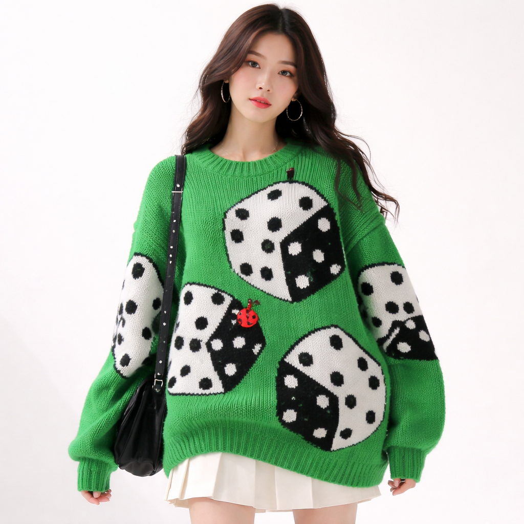 Korean Fashion fashion design: Chunky bright green sweater, oversized fit, prominent black and white dice pattern. A single cute red ladybug accents one dice face. Cotton knit.