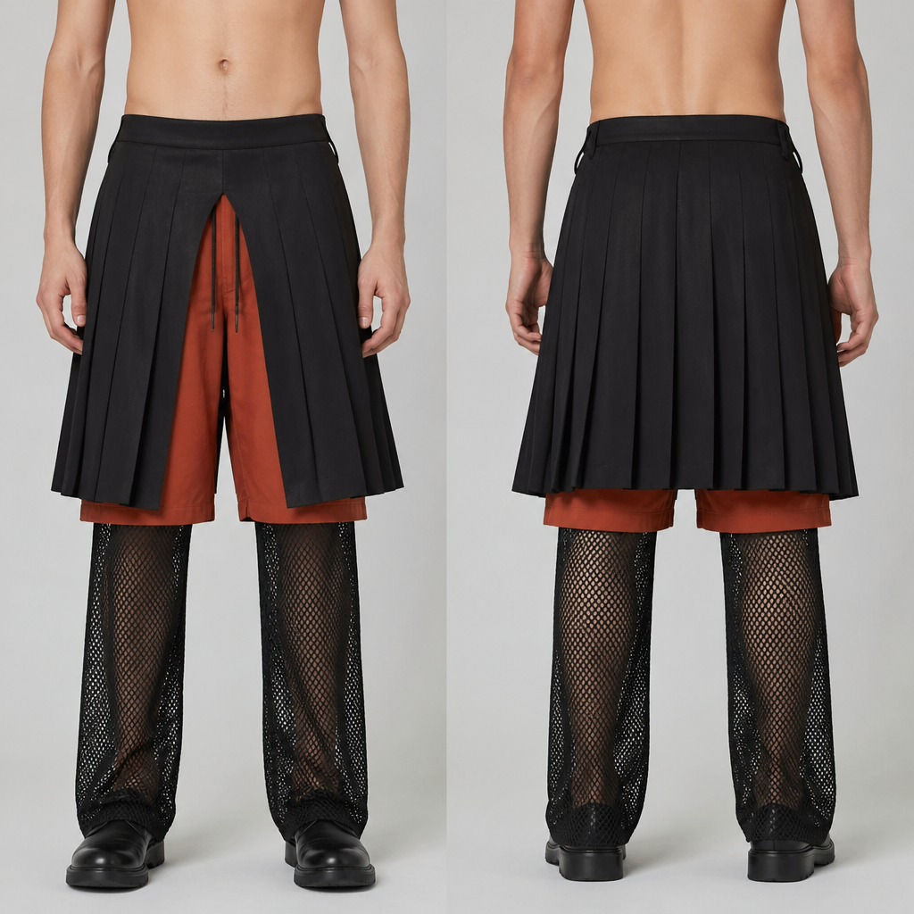 photorealistic fashion design, A Male Skirt design, suitable for Spring. can you design a 3/4 pleated black linen skirt with a central cut out with a rust coloured canvas shorts and a black net trouser underneath that. Design with modest coverage., just the design no text, show front and back