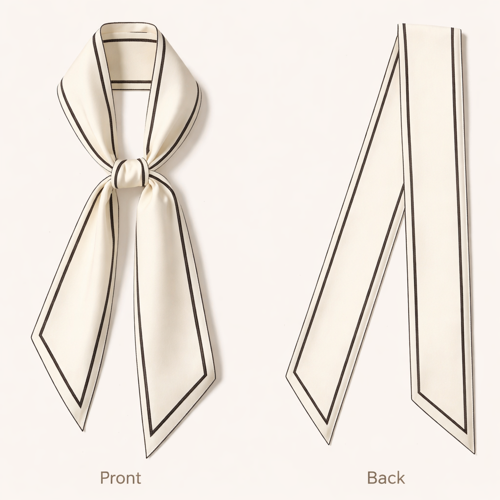 Design a silk scarf that is 5 x 86 cm with oblique edges. Double-Line Border • Design: Minimal center field • Borders: Two thin parallel lines running the length • Effect: Chanel-adjacent, very polished
