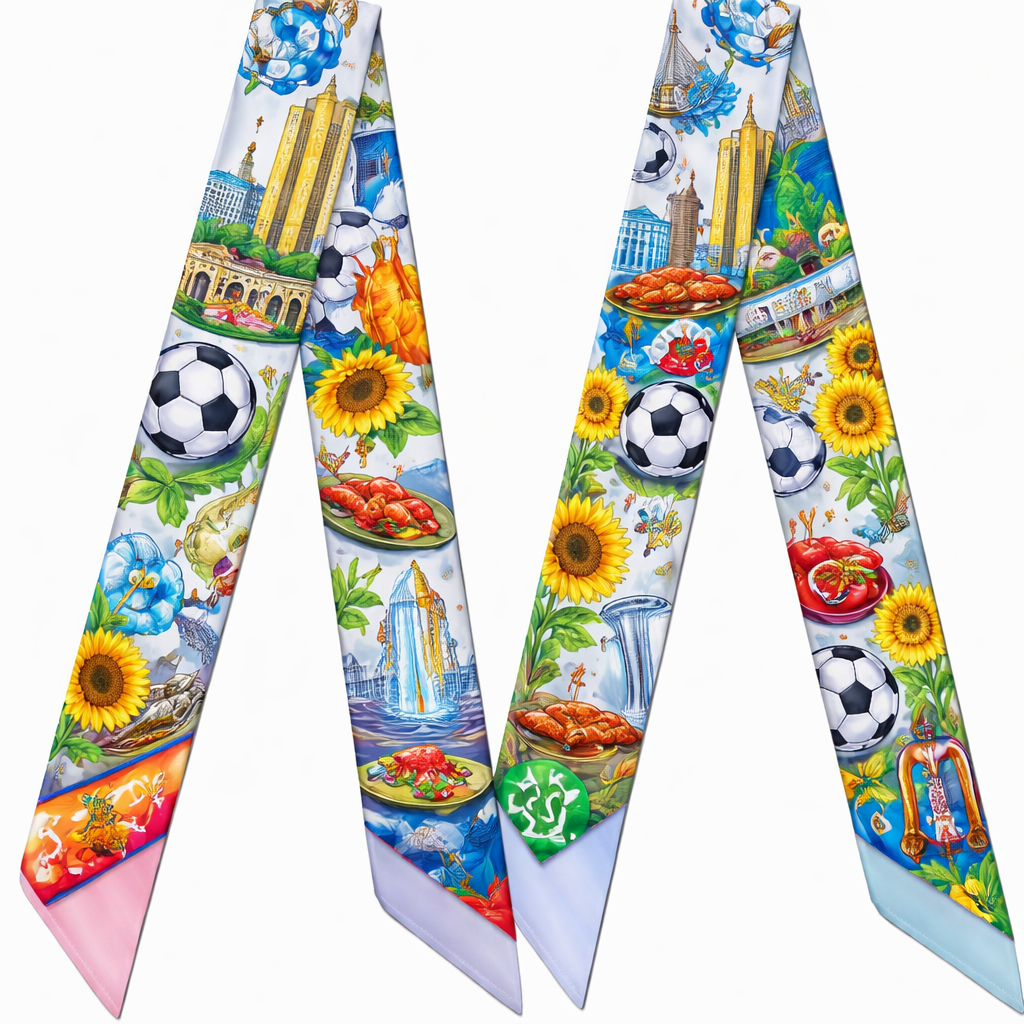 Design a 5cm x 86cm silk twilly scarf inspired by Kansas City, Missouri as a FIFA World Cup 2026 host city. No fan merch, words or logos. , show front and back