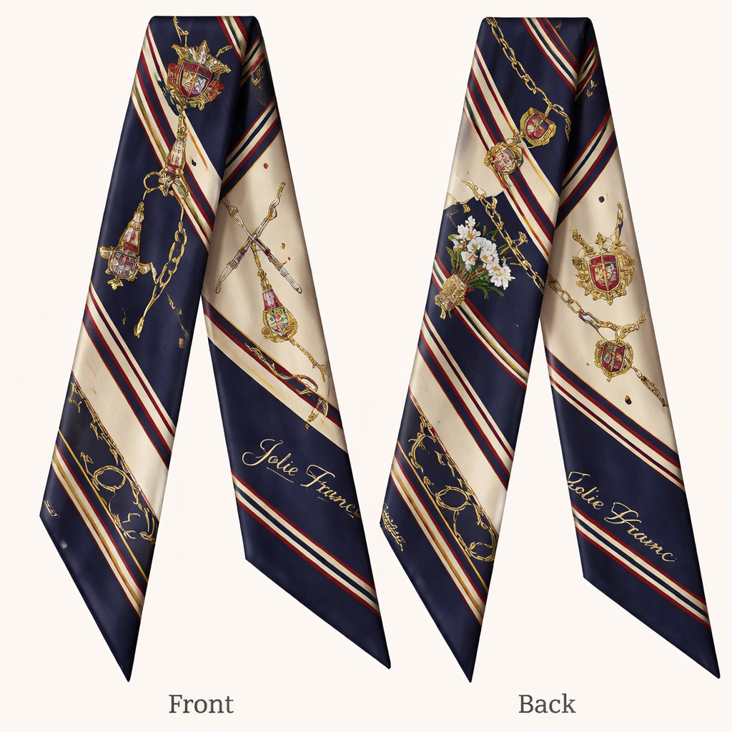 Design a silk scarf thanks 5x 86cm to be wrapped on the handle of a purse. No logos or any school relation but a collegiate feel. Create a signature look for my brand Jolie Franc, classic style, show front and back
