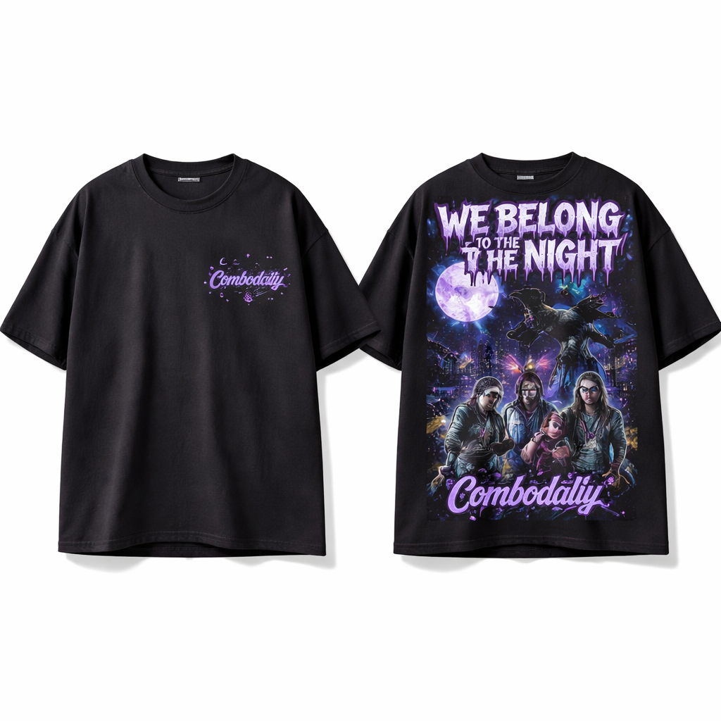 Combodaily streetwear brand t-shirt with graphic back print We belong to the night , streetwear style, show front and back