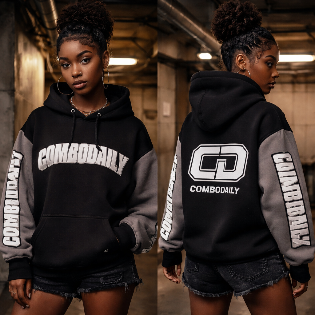 Combodaily branded on back hoodie sleeves on a black girl model in a basement environment , streetwear style, show front and back