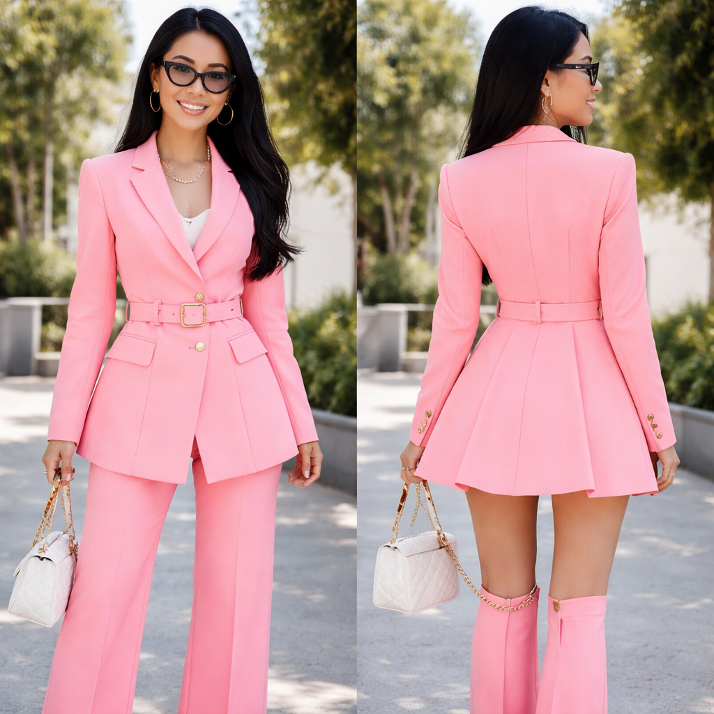 Pink pants suit that turn into a dress black glasses black hair braces , preppy style, show front and back