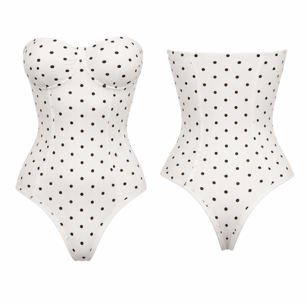 Shape wear no ai model all cotton seamless g string body suit white and black pocker dots strapless corset no built in bra just corset in bodysuit no undies other way around , classic style, show front and back