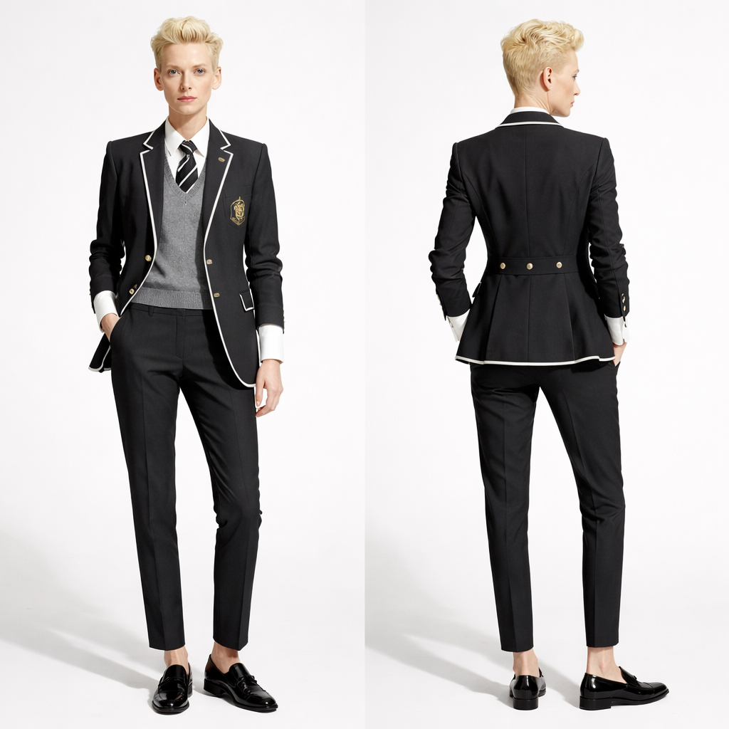Cigarette pants Androgynous Tilda Swinton , school_uniform style, show front and back