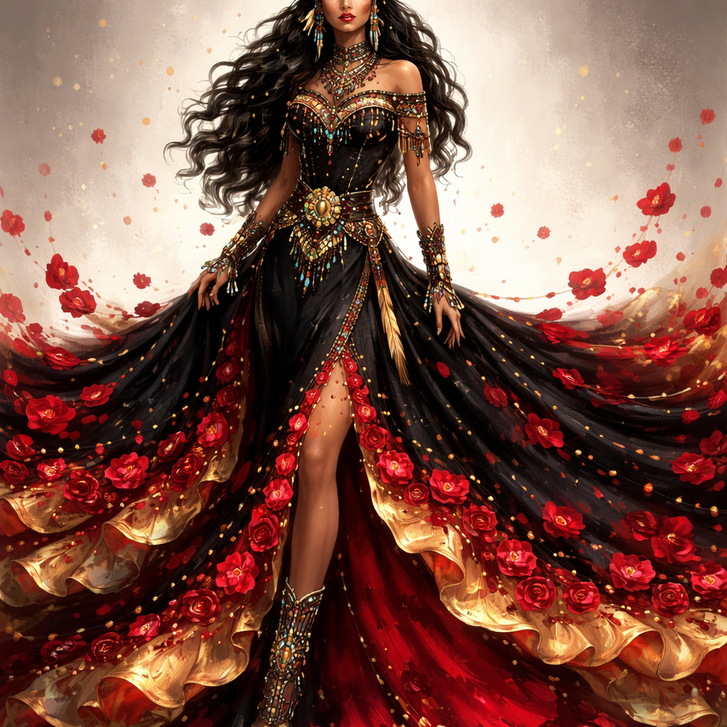 Native American dress with rose petals in the dress black gold and red , indigenous style