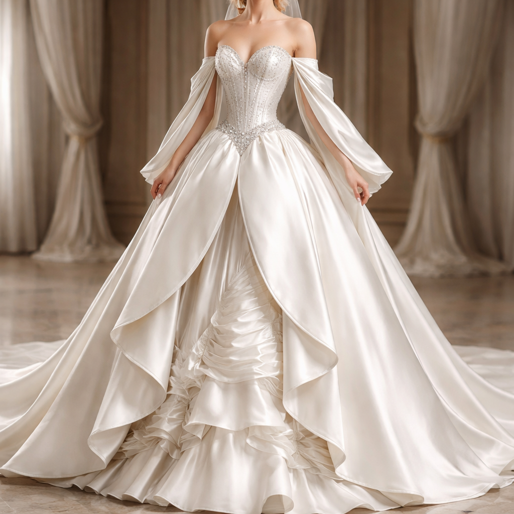 Genera una imagen final del vestido de novia con los detalles escritos sobre la tela y el diseño. Quiero que el corset sea rígido con una con algo de pedrería en la parte inferior del corsé y en los bordes de escote. El escote quiero que sea palabra de honor y no muy pronunciado. En cuanto a la falda, tiene dos capas, una superior simulando dos pétalos ovalados que se abren desde la punta del corsé, y una capa inferior con cuatro volantes fluídos en satén dispuestos horizontalmente. Quiero que tenga bastante volumen, siendo la parte externa lisa y la parte interna con pliegues horizontales de satén en los tercios distales, simulando un lirio o un tulipán invertido. Las mangas quiero que sean de satén y que sean colgantes muy fluidas. Mantén el diseño del anterior pero haz muchos menos volantes en la capa inferior de la falda, solo quiero 3 o 4, designer style