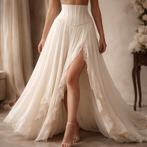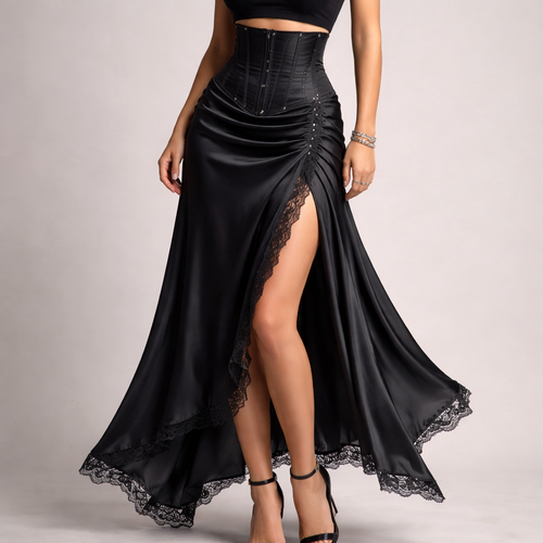 Long skirt, flowing light fabric, asymmetric length. Top part of the skirt works almost like a corset, accentuating hip ...