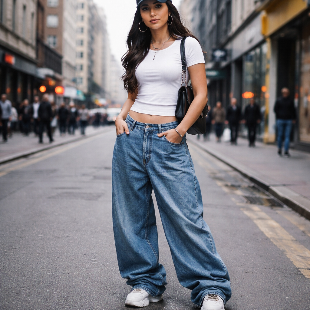 Baggy blue jeans Tight white shirt not crop top , streetwear style