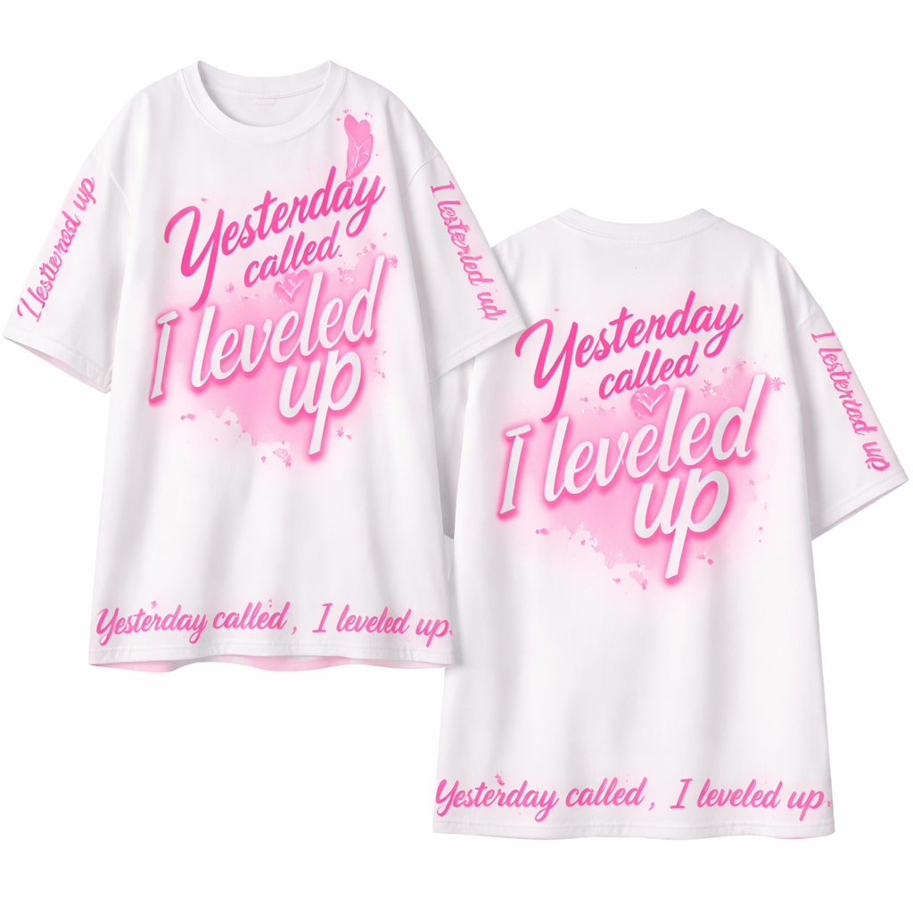 Maak een t-shirt met een slogan Yesterday called, I leveled up en dan met de kleur wit en neon roze zet de slogan aan de zijkant de mouwen en aan de onderkant met een klein hartje achter de tekst ( maak het een onvergetelijke t-shirt) , show front and back