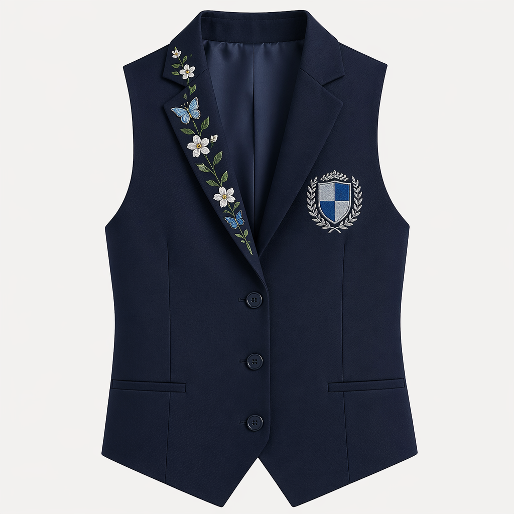 A Unisex Dress design, suitable for Spring. usando la imagen de referencia crea el mismo chaleco azul pero con los mismos bordados únicamente en la solapa de enfrente y añade un escudo escolar en el pecho del lado contrario a la solapa bordada