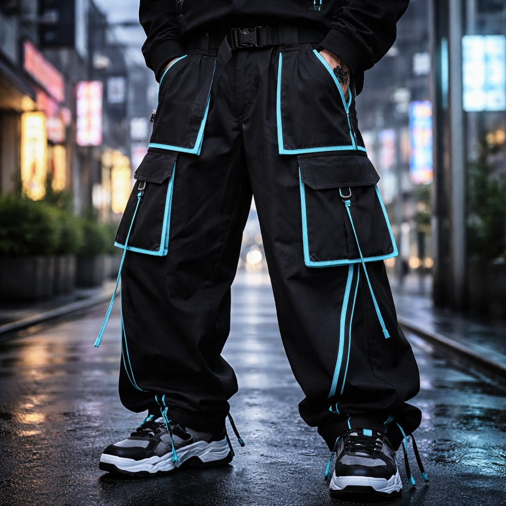 Japanese Street fashion design: Black cotton cargo pants with aqua trim, wide-leg, relaxed fit, techwear-inspired.