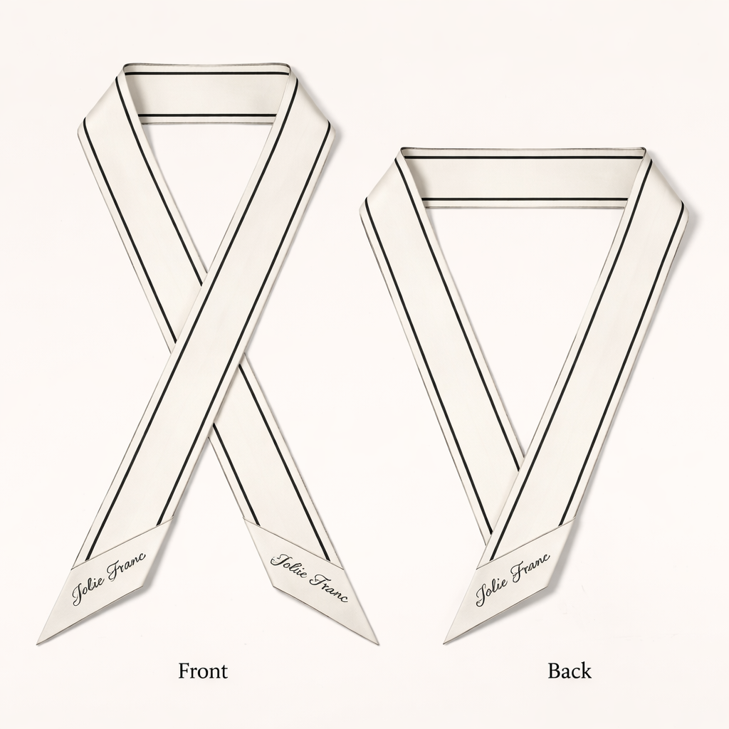 Design a silk scarf that is 5 x 86 cm with oblique edges. Double-Line Border • Design: Minimal center field • Borders: Two thin parallel lines running the length • Effect: Chanel-adjacent, very polished Add Jolie Franc at the oblique edge