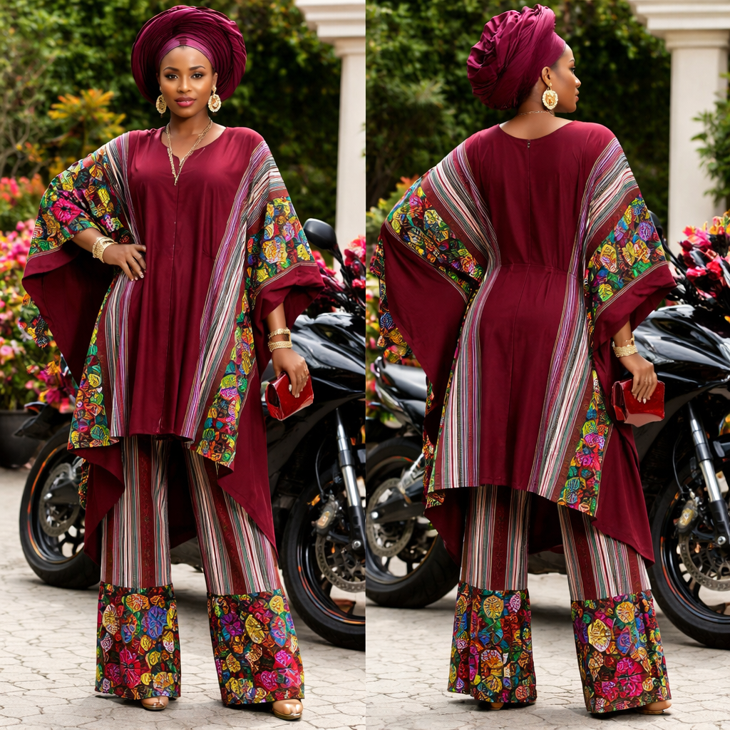 I want create a kaftan and pant from 8inch wide plain burgundy aso oke and striped burgundy, green, white, and pink aso oke mixed with colorful Ankara that will look gracefully on a real human African woman posing by a motorcycle in a beautiful court yard beside beautiful flowers