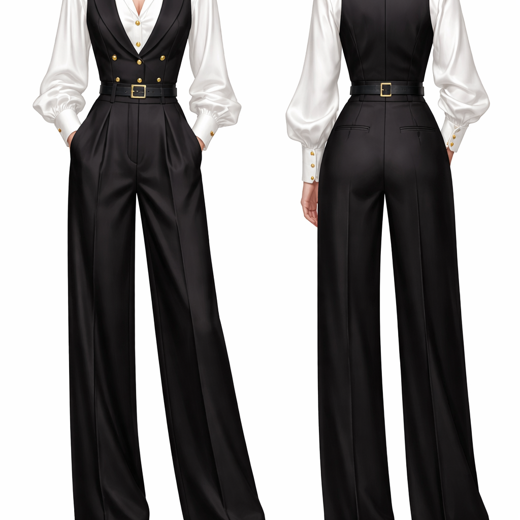 don’t draw the face but the texture of the cloth should be of that of a suit black baggy trousers paired with a white shirt that is made of silk but white in color and has gold buttons and a half vest blazer with also gold buttons paired with a belt , show front and back
